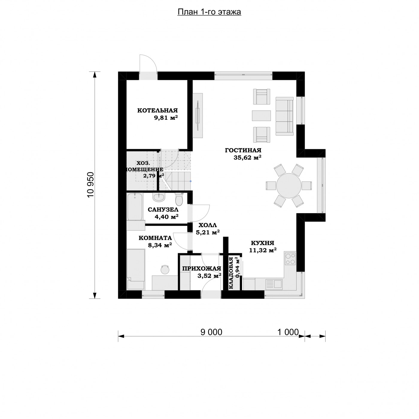 1 этаж 1 прихожая 3,73 м² 2 холл 7,33 м² 3 комната 8,62 м² 4 санузел 4,44 м² 5 хоз. помещение 2,9 м² 6 котельная 10.09 м² 7 гостиная 34,02 м² 8 кухня 12 м² 9 кладовая 1,15 м² Всего 84,28 м² |