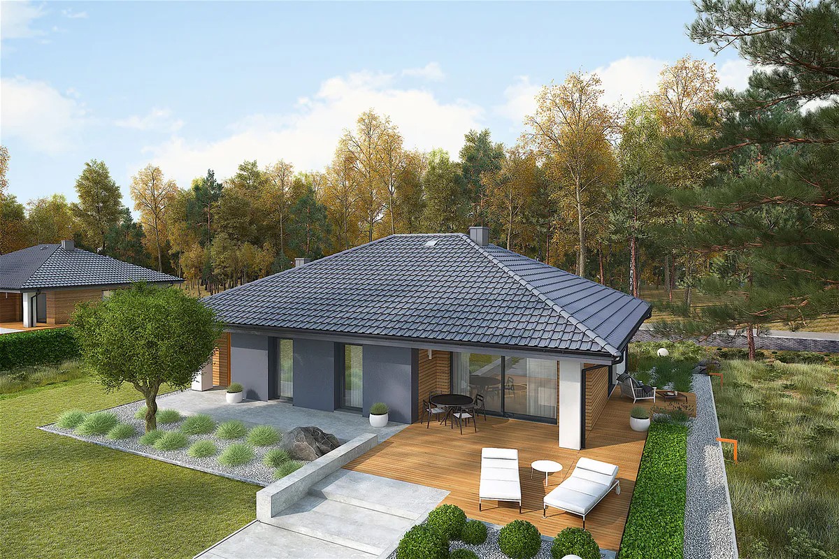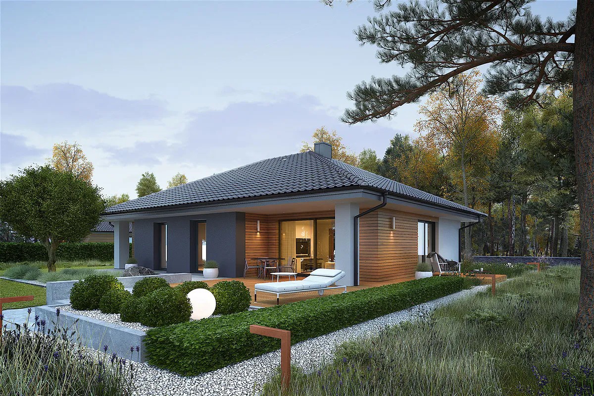 Яркий фасад с деревянными элементами и серыми панелями отлично сочетается с шатровой крышей, покрытой серой металлочерепицей. В задней части дома есть просторная терраса, где вы можете провести время на свежем воздухе со своими близкими.