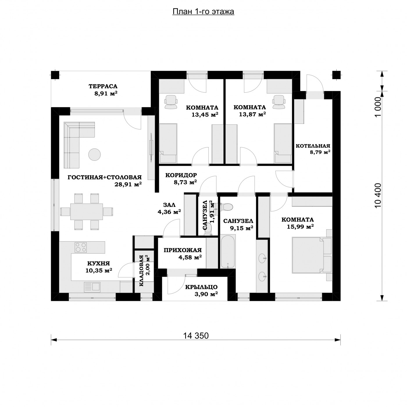Одноэтажный дом из газобетона 11 на 14 под ключ имеет такую функциональную планировку, которая позволяет успешно адаптировать её к большинству участков. Проект относится к категории домов для узкого пространства, поэтому поместится на земельном наделе, ширина которого не превышает 16 метров.