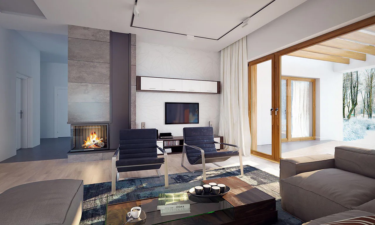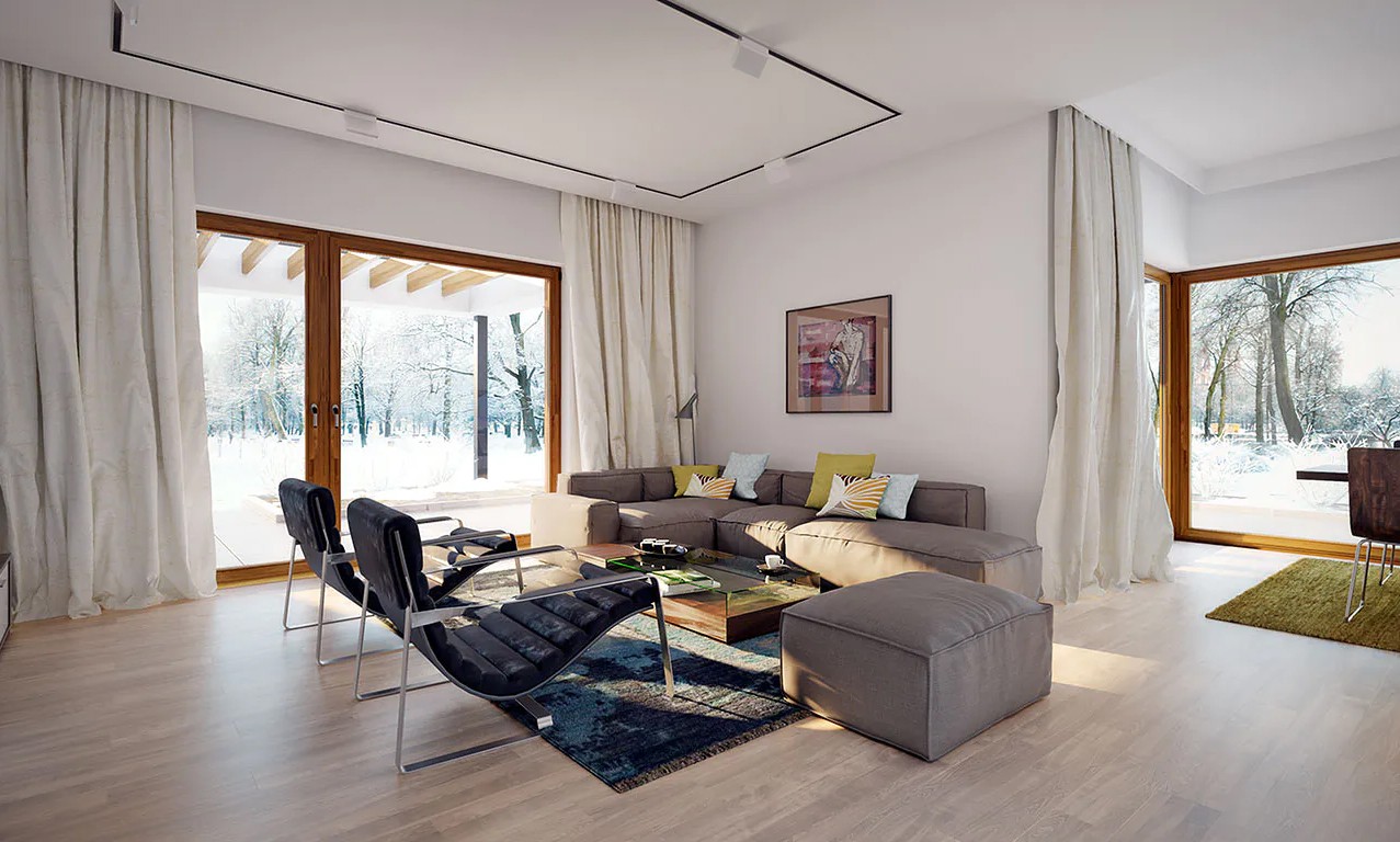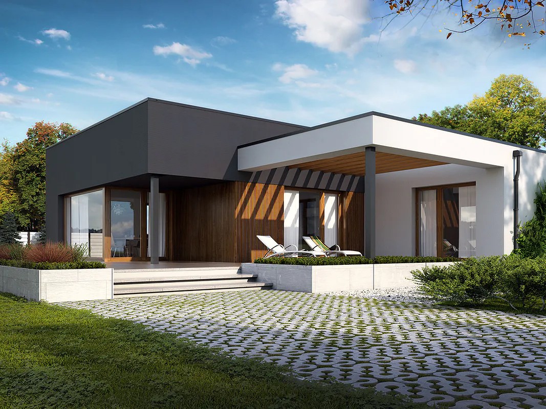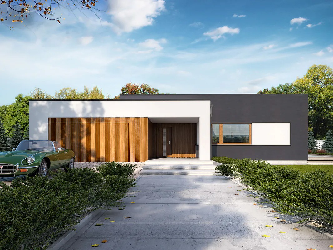 Одноэтажный дом с плоской крышей 19 на 17 с гаражом