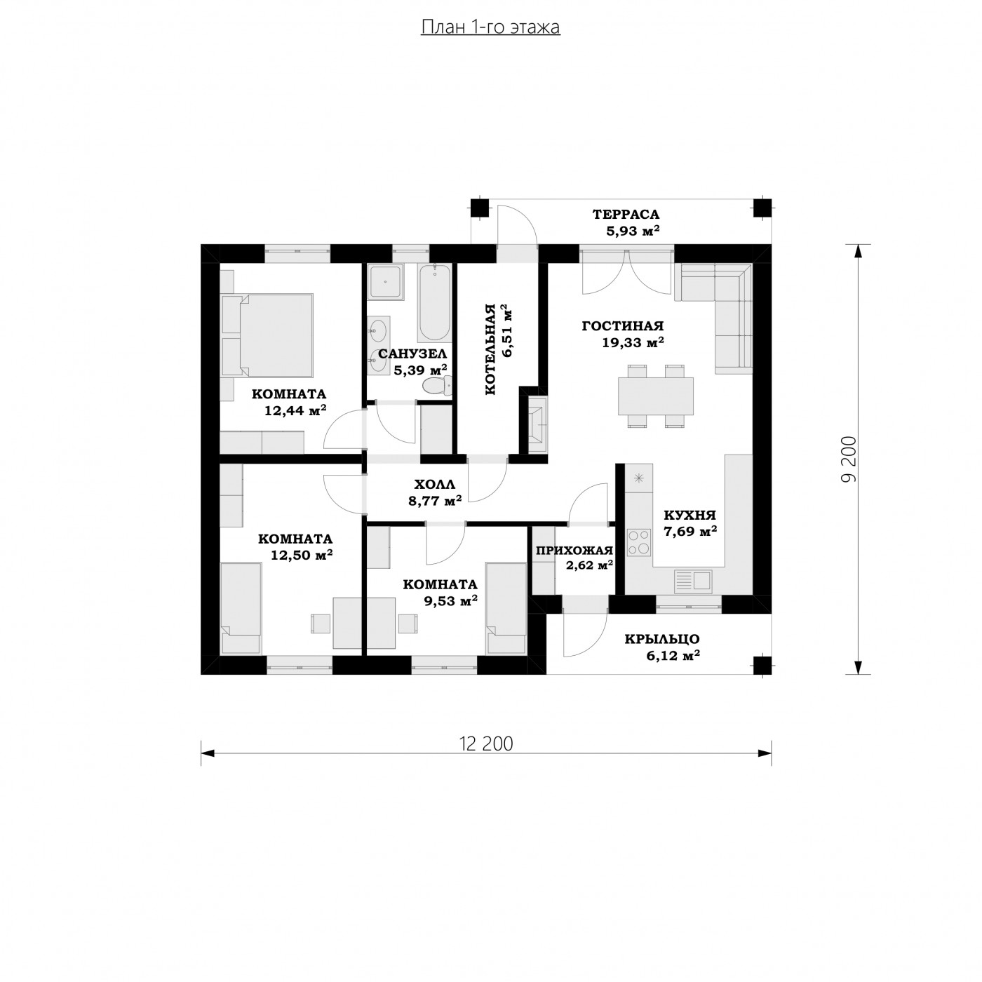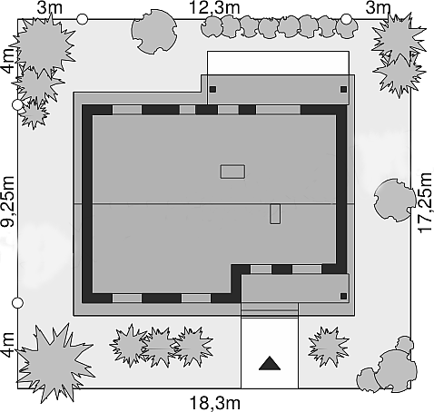 Небольшой одноэтажный дом 12 на 9. Минимализм по количеству несущих стен делает дом дешевым и быстрым в строительстве. Открытая дневная зона состоит из солнечной комнаты с камином и эргономичной кухни, объединенной со столовой. Раздвижная дверь соединяет ее с зеленой сферой сада. Гостиный уголок дома состоит из трех спален и полностью оборудованной ванной комнаты. Котельная была спроектирована для размещения прачечной и была многофункциональным местом, где можно хранить садовую мебель (наружные двери). Сплошной потолок позволяет обустроить большой чердак по индивидуальному усмотрению. Интересное решение для узких участков или для террасных домов. Отличное предложение для семьи из 4-5 человек.