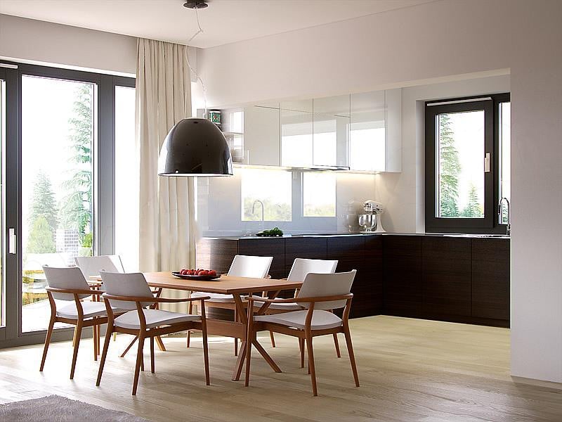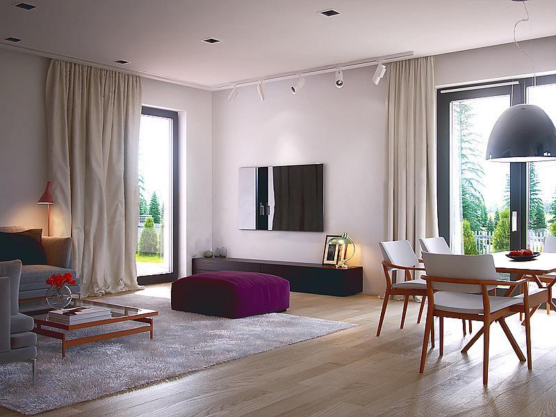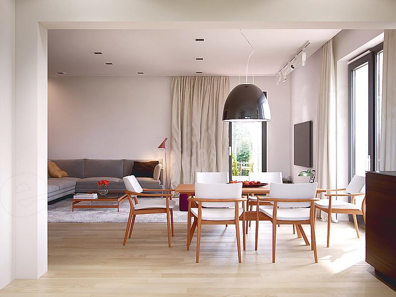 Гостиная и кухня разделены обеденной зоной – большим столом, где сможет собираться вся семья ? Такое зонирование делает интерьер более просторным. По желанию в гостиной можно установить камин, чтобы ваши вечера были ещё теплее и душевнее?
