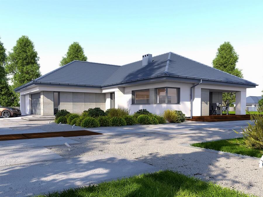 Проект "Мюнхен" - проект одноэтажного дома с гаражом на две машины. Дизайн дома характеризуется привлекательным внешним видом и может быть отделан высококачественной каменной облицовкой, которая усиливает эффект элегантности и стиля. Шатровая крыша с правильным наклоном придает дому правильную пропорцию и стиль. План дома внутри характеризуется продуманным функциональным расположением просторных комнат. Стоит упомянуть многочисленные кладовые и дополнительные помещения, которые позволят убирать вещи до следующего сезона. Дом имеет крытую террасу с элегантными формами, которая является неотъемлемой частью архитектуры дома, создавая единое целое.