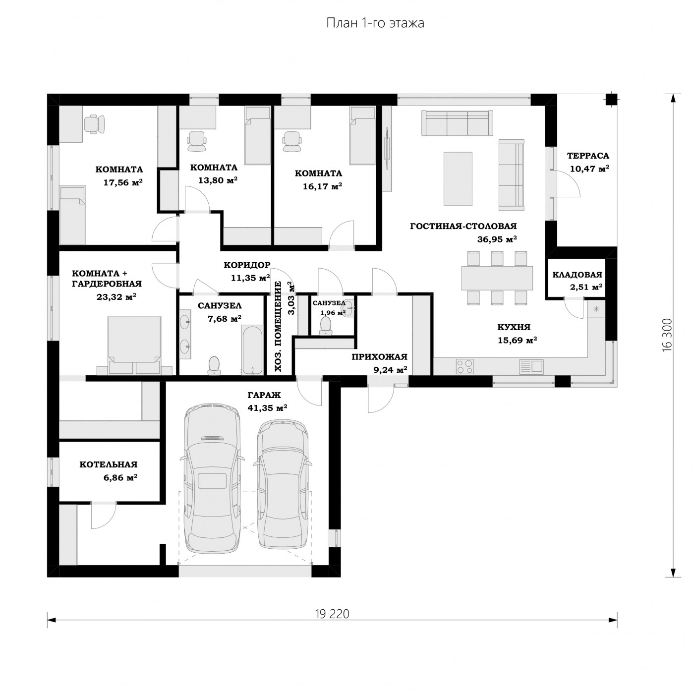 | 1 этаж 1 прихожая 8,3 м² 2 кухня 14,5 м² 3 кладовая 2,2 м² 4 гостиная + столовая 35,8 м² 5 комната 12,8 м² 6 комната 14,2 м² 7 комната 17 м² 8 комната + гардеробная 19,1 м² 9 санузел 6,6 м² 10 холл 9,5 м² 11 хоз.помещение 2,3 м² 12 санузел 1,5 м² 13 котельная 4,6 м² 14 гараж 41,5 м² Всего 189,9 м² |