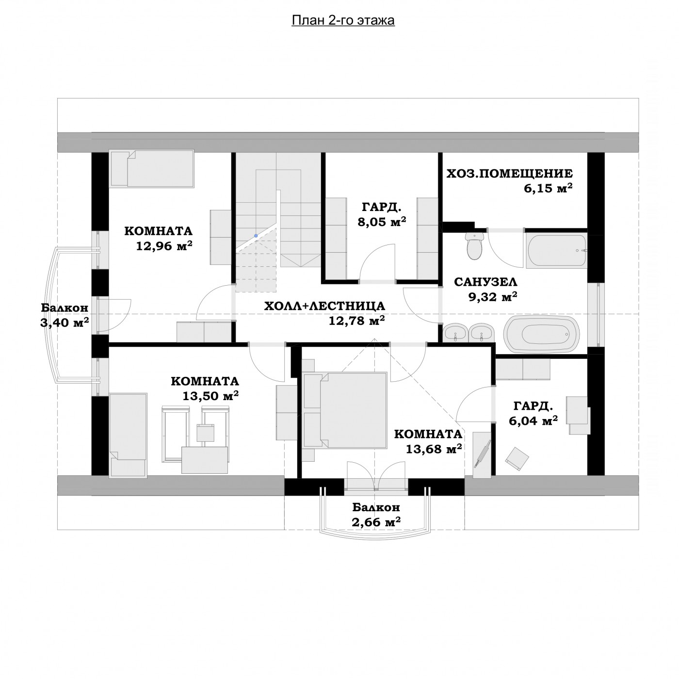 2 этаж 1 холл + лестница 12,25 м² 2 комната 13,1 м² 3 комната 12,08 м² 4 гардеробная 6,79 м² 5 хоз.помещение 5,87 м² 6 санузел 9,58 м² 7 гардеробная 5,59 м² 8 комната 13,1 м² Всего 78,36 м² |