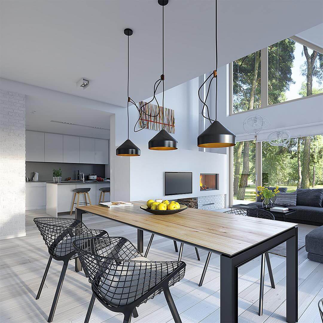 Проходя через вход мы попадаем в отдельную прихожую. За стенкой оборудована спальня. Особенность первого этажа в том, что гостиная и кухня разделены между собой, что в современных проектах встречает уже реже и относится к более «классическим» вариантам. Но у данного решения есть и свои плюсы: кухня оборудована «островком», на котором процесс готовки будет значительно удобнее, а запахи готовых блюд не будут проникать в гостиную. Говоря чуть больше о гостиной – это отдельная зона, которая совмещает в себе и столовую, которая отлично подойдет для приема гостей. Камин в этой зоне создаст неповторимую атмосферу тепла и уюта.