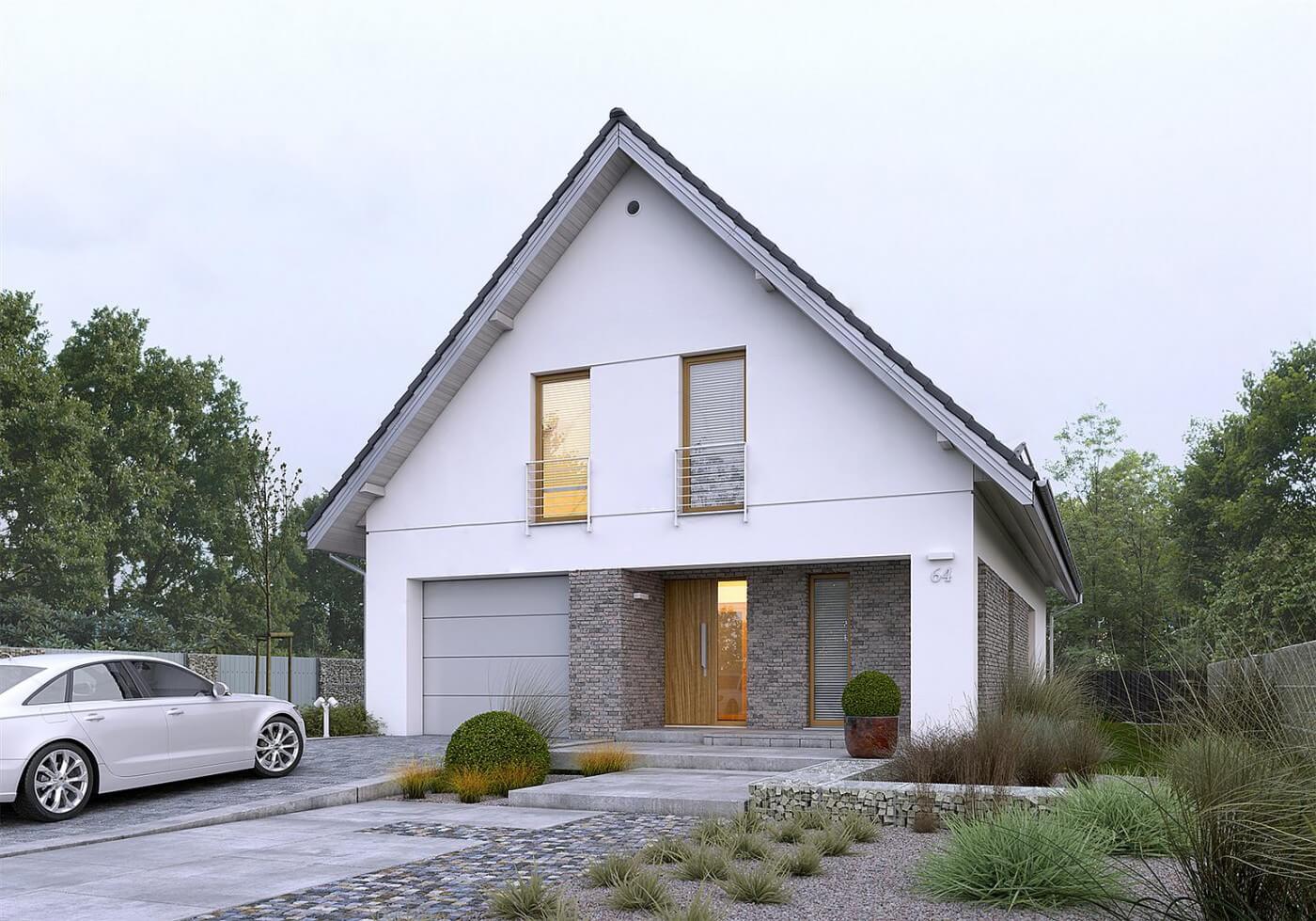 Дом 9 на 15 по проекту «Афины» идеально подойдет под участок средней ширины. В доме предусмотрен единый гараж, встроенный в само здание. Данный вариант отлично подойдет для тех, кто искал дом с двускатной крышей. Это решение делает строительство дешевле и проще.