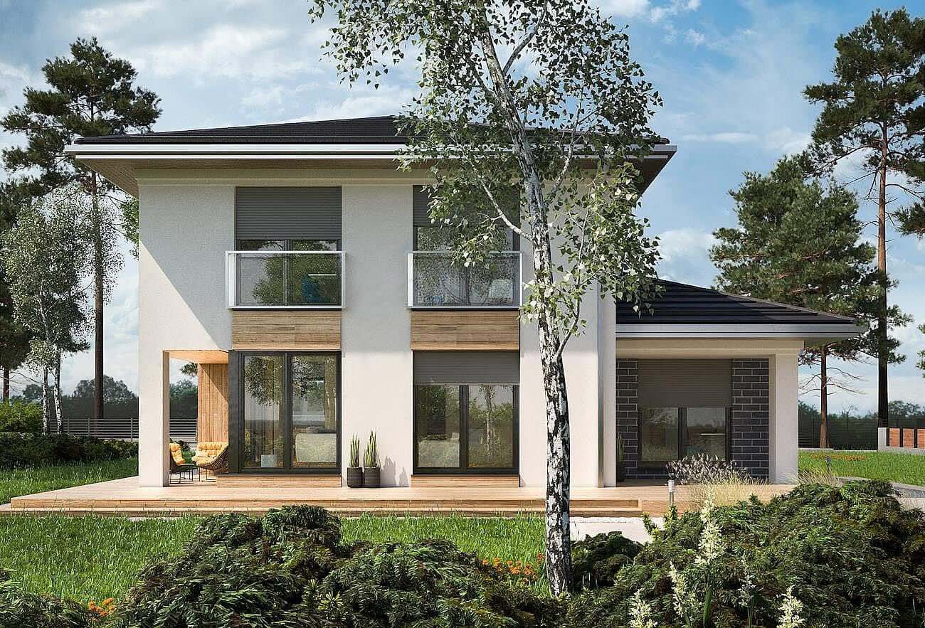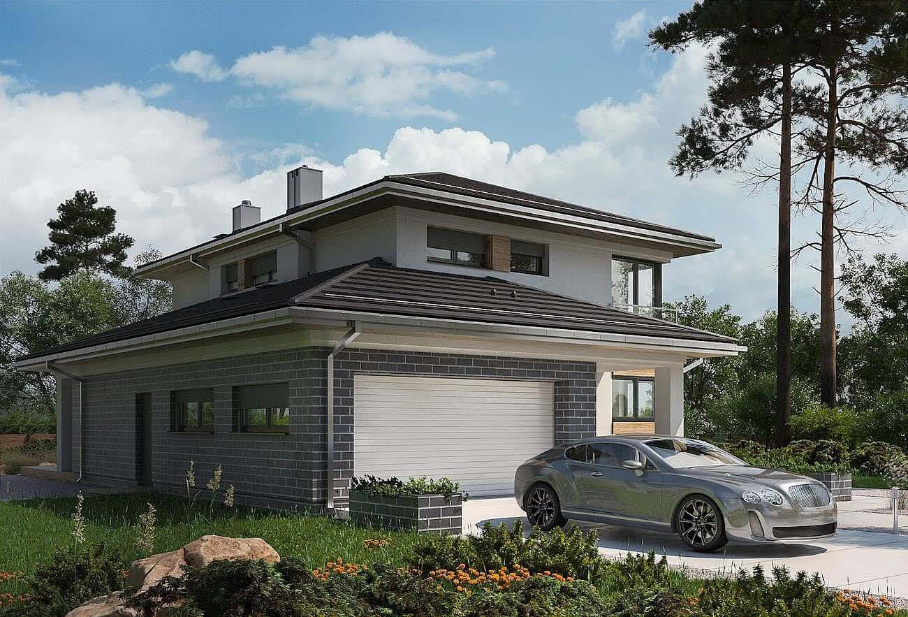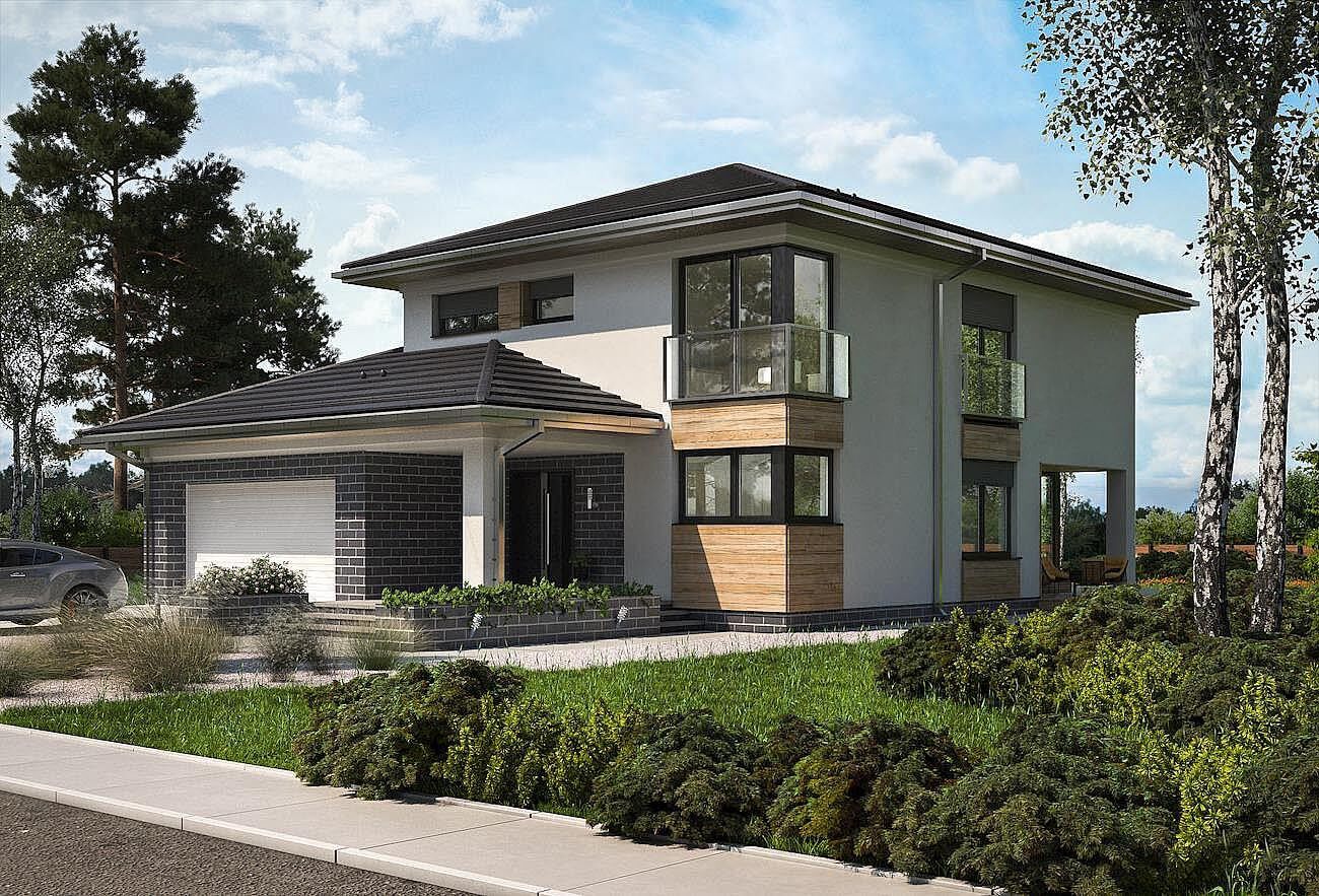Дизайн дома "Оклахома", уникальный в предложении Рам Вилла, является двухэтажным зданием, с гаражом, и имеет современный, городской характер. Он предлагает большую, удобную квартиру с не очень крутыми шатровыми крышами над планом, построенным из перекрывающихся прямоугольников. Из него выходит прямоугольное двухэтажное здание, окруженное с одной стороны более низким зданием, выступающим вперед. Здесь находится гараж, котельная, а сзади - кабинет у гостиной. Кроме того, часть его крыши, поддерживаемая на шесте, покрыта входной террасой. За глубокой аркадой в алькове, холлом с выходом в гараж, а за холлом - просторная гостиная. Небольшой кабинет примыкает к саду, столовой и кухне с кладовой с фасада. Частично открытая лестница с кладовой ведет наверх в четыре комнаты. Существует также прачечная и набор из двух ванных комнат, одна из которых относится только к главной спальне. Большое остекление балкона, заключенное в вертикальные полосы на фасадах, угловые окна в дизайне дома «Оклахома» и садовые подрезанные террасы смягчают строгость блока. Общие габариты объекта чуть белее - 12 х 15 м.