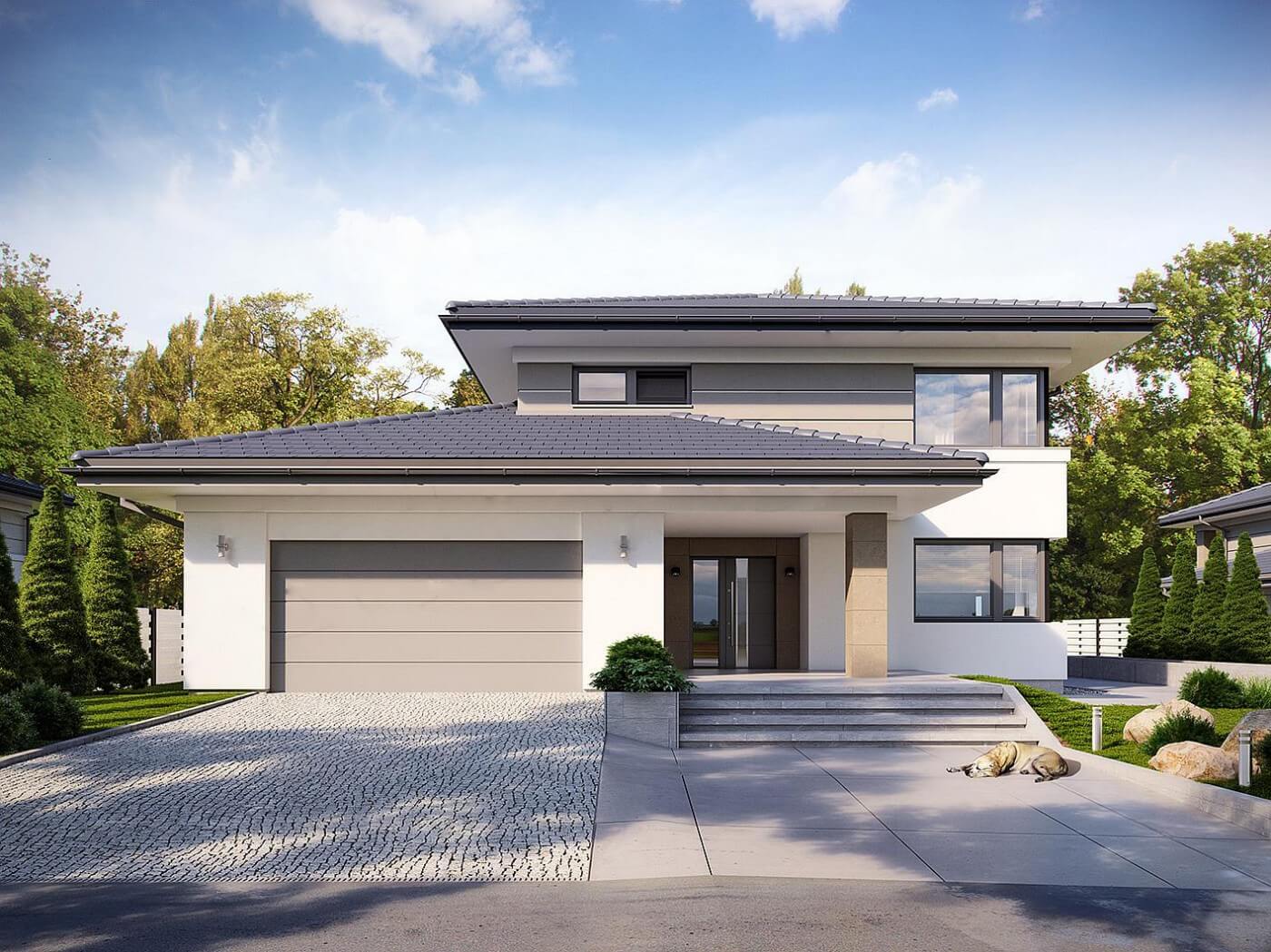 "Лион" - проект представительского двухэтажного дома для семьи из 4 человек. Это типичная городская резиденция с современным обликом, размером 15 х 15 и оптимальной полезной площадью. Первый этаж был спроектирован как открытое жилое пространство, состоящее из объединенной гостиной, столовой и кухни. Здесь также есть дополнительная комната, которая может быть использована как кабинет или дополнительная спальня. На первом этаже также есть большая котельная для каждого вида топлива и гараж на две машины, благодаря покрытию частично крытых террас, частная зона отдыха была получена на террасе. На первом этаже расположены 3 спальни, ванная комната и прачечная. В главной спальне есть свой гардероб и ванная комната. Такое дополнительное пространство можно преобразовать, например, в рабочий уголок. "Лион" впечатляет утонченной, неподвластной времени классической формой, запечатленной в современном элегантном образе. Эта резиденция является отличным предложением для инвесторов, ищущих удобный и эстетичный дом.