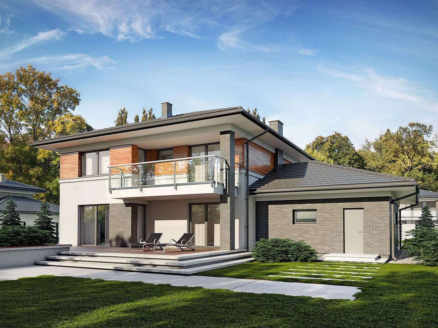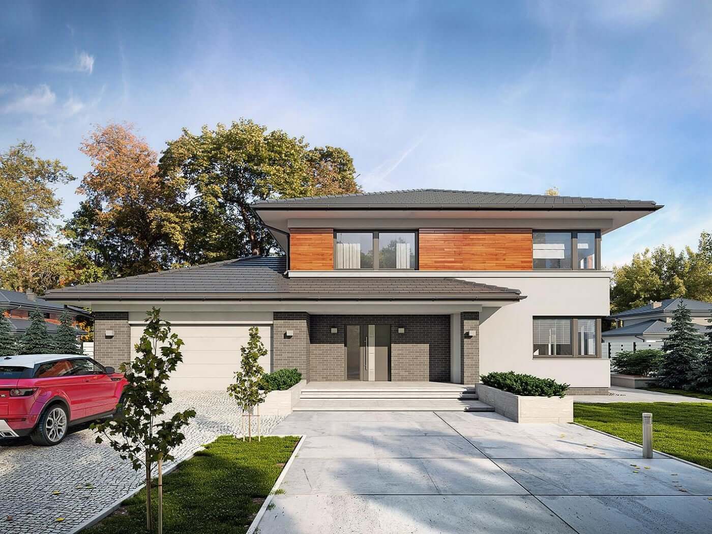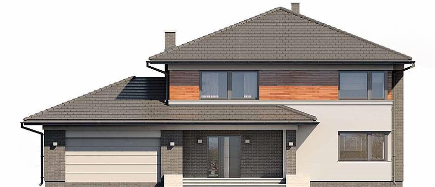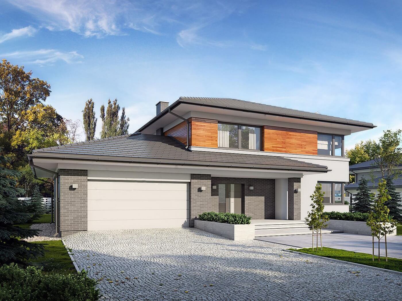 "Манчестер"- проект представительного двухэтажного дома для семьи из 5 человек. Это типичная городская резиденция с современным обликом и оптимальной полезной площадью. Он имеет богатую функциональную программу, расположенную на двух этажах, что обеспечит комфорт даже для требовательных инвесторов. Первый этаж был спроектирован как открытое жилое пространство, состоящее из объединенной гостиной, столовой и кухни. Здесь также есть дополнительная комната, которая может быть использована как кабинет или дополнительная спальня. На первом этаже также есть большая котельная, для каждого вида топлива и гараж на две машины. На первом этаже расположены 4 спальни, ванная комната и прачечная. Проект дома 18 на 12 впечатляет утонченной, неподвластной времени классической формой, воплощенной в современном элегантном образе.