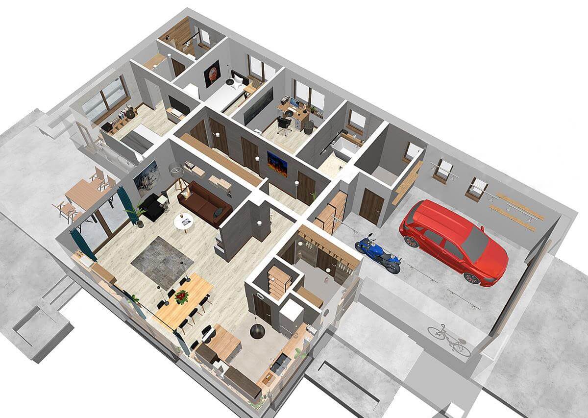 Просторный и комфортабельный интерьер одноэтажного дома "Сидней" был заключен в разложенный в современном стиле блок. Продолговатая форма здания, вызванная гаражом вперед, требует большего участка. Форма самого дома довольно классическая, потому что он покрыт конвертовой крышей, но клинкер и деревянные акценты на фасаде придают ему современную эстетику. Гостиная была полностью открыта для зала, усиливая ощущение простора в интерьере. В углу запланирован камин, гарантирующий уникальность места, рядом с ним предлагается столовая. Гостиная выходит на многоуровневую террасу, прекрасно дополняющую форму дома, и благодаря частичной кровле, позволяющей отдыхать даже в непогоду. Рядом находится кухня с небольшой, но удобной кладовой. коридор, там, где расположена спальня, она начинается с ванной комнаты, специально расположенной в коридоре, чтобы гости могли иметь к ней свободный доступ. Далее три спальни, в том числе одна с гардеробной и ванной комнатой. Сам коридор между комнатами достаточно широк, чтобы легко поместиться в большой встроенный шкаф, компенсируя отсутствие гардероба. Просто пройдите через тамбур, чтобы быстро и комфортно добраться до подсобного помещения, где запланировано место для двух автомобилей и отдельное подсобное помещение. Элегантно представленный дом Bianka привлекает не только привлекательным фасадом, но, прежде всего, ярким и просторным интерьером, который отвечает даже высоким требованиям жителей. Одним из преимуществ является идеальное расположение спальни вдали от гостиной, чтобы отделить отдых от повседневной деятельности.